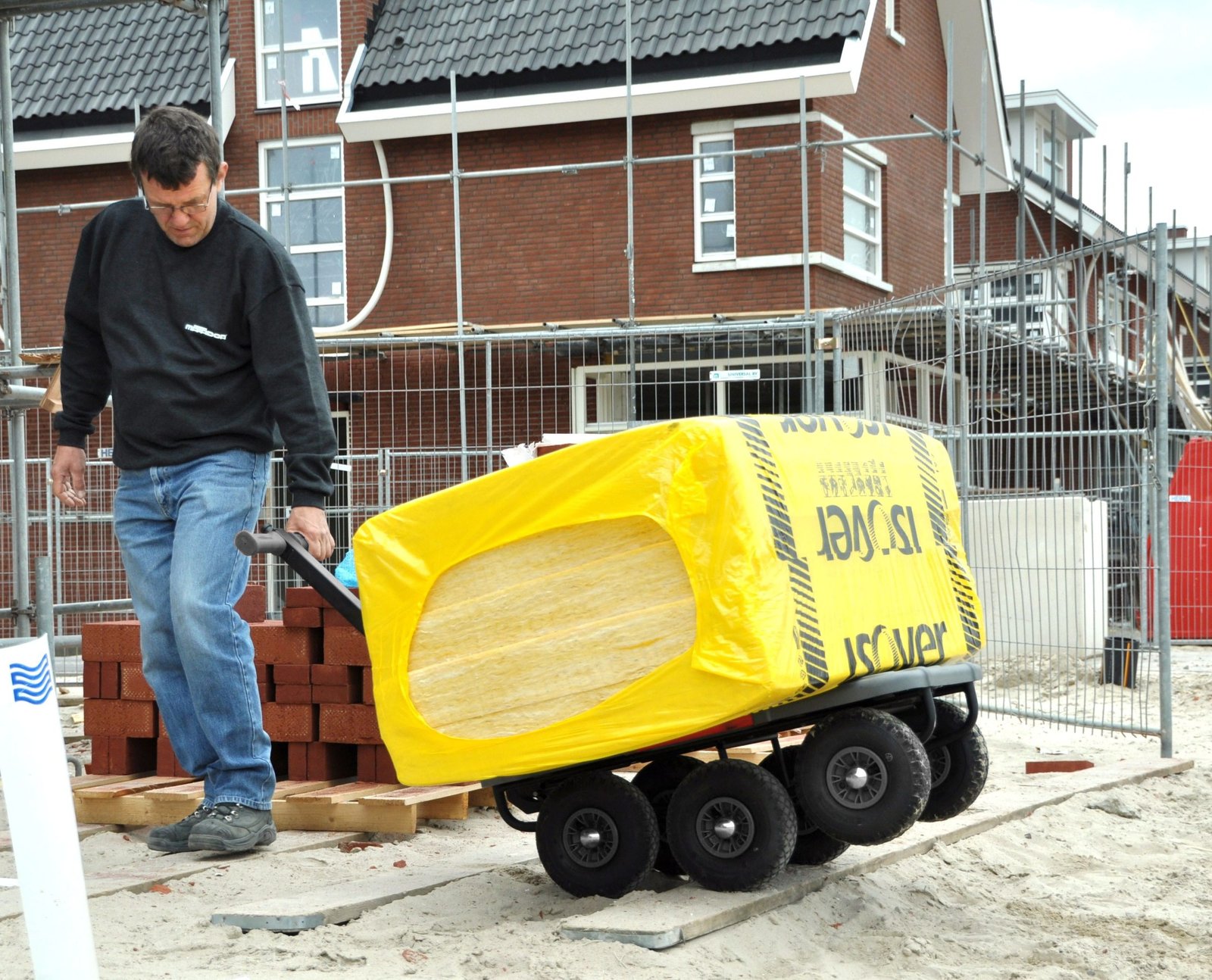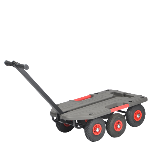 Der Plattformwagen Matador mit klappbarem Griff eignet sich ideal für den Transport von Waren und Lasten auf unebenem Gelände. Die großen Transportrollen auf 3 Achsen ermöglichen ein schnelles und müheloses Bewegen auf Baustellen oder Montageorten. Transportieren Sie Lasten bis zu 250 kg, wie Werkzeuge, Arbeitsmaterialien, Sackwaren oder Dämmmaterialien. Der klappbare Griff lässt sich platzsparend in die Plattform des Transportgeräts integrieren. Mit einem Eigengewicht von nur 26 kg kann das Gerät einfach und mühelos mithilfe der seitlichen Griffe im Fahrzeug verstaut werden.