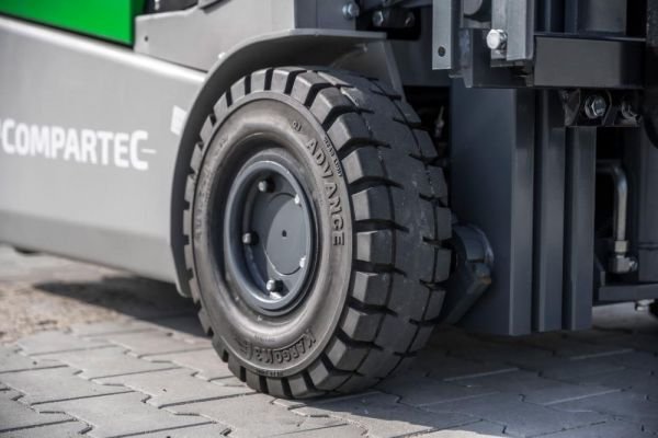 Die montierten Vollgummireifen überzeugen durch geringen Rollwiderstand, was wiederum den Fahrwiderstand und somit den Energieverbrauch senkt.