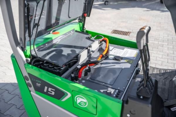 Die integrierte Lithium-Ionen-Batterie (202 Ah) lädt sehr schnell auf, sodass der Elektrostapler ohne lange Unterbrechungen wieder einsatzbereit ist.