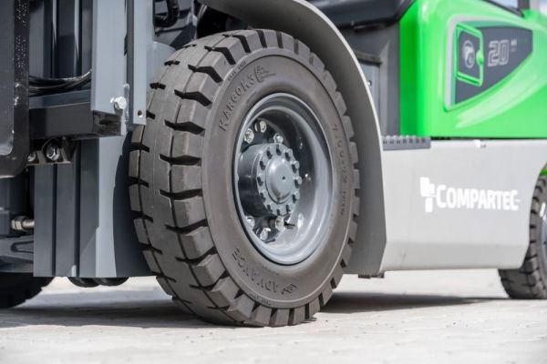 • Vollgummireifen mit geringer Rollreibung verringern den Energieaufwand