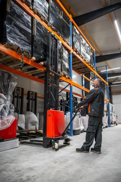 Der halb-elektrische ECO-Hubwagen von companyshop ist ideal für den Transport von palettierten Waren in Lagern, Produktionsstätten und Regalsystemen. Mit einer Tragfähigkeit von bis zu 1500 kg und einer Hubhöhe von bis zu 3500 mm deckt der halb-elektrische Hubwagen denselben Einsatzbereich ab wie ein klassischer Gabelstapler. Die Last wird elektrisch gehoben, während der Transport manuell erfolgt, wodurch das Heben und Bewegen auch auf höheren Regalebenen erleichtert wird.