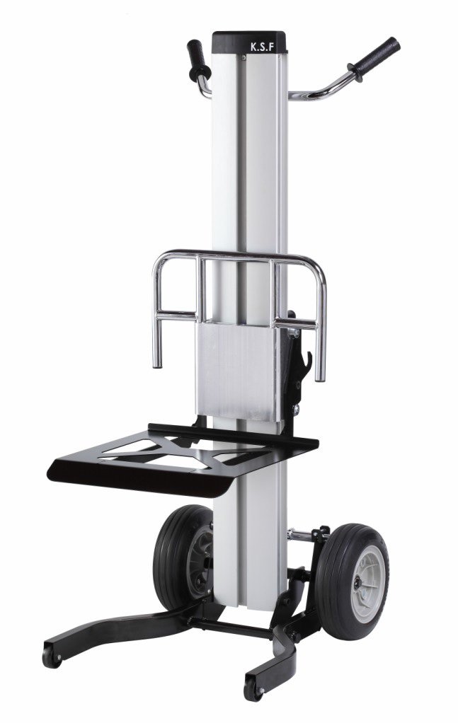 Die Aluminium-Konstruktion sorgt für ein niedriges Eigengewicht von nur 20 kg. Die patentierte Kurbel ist einfach zu bedienen, der komplett geschlossene Seilzug sorgt für leisen Betrieb dank ruckfreiem Bremssystem. Die Räder ermöglichen einfachen Transport auch auf unebenen Flächen. Durch das Zusammenklappen von Plattform und Stabilisatoren lässt sich die Hubkarre leicht transportieren und platzsparend lagern.