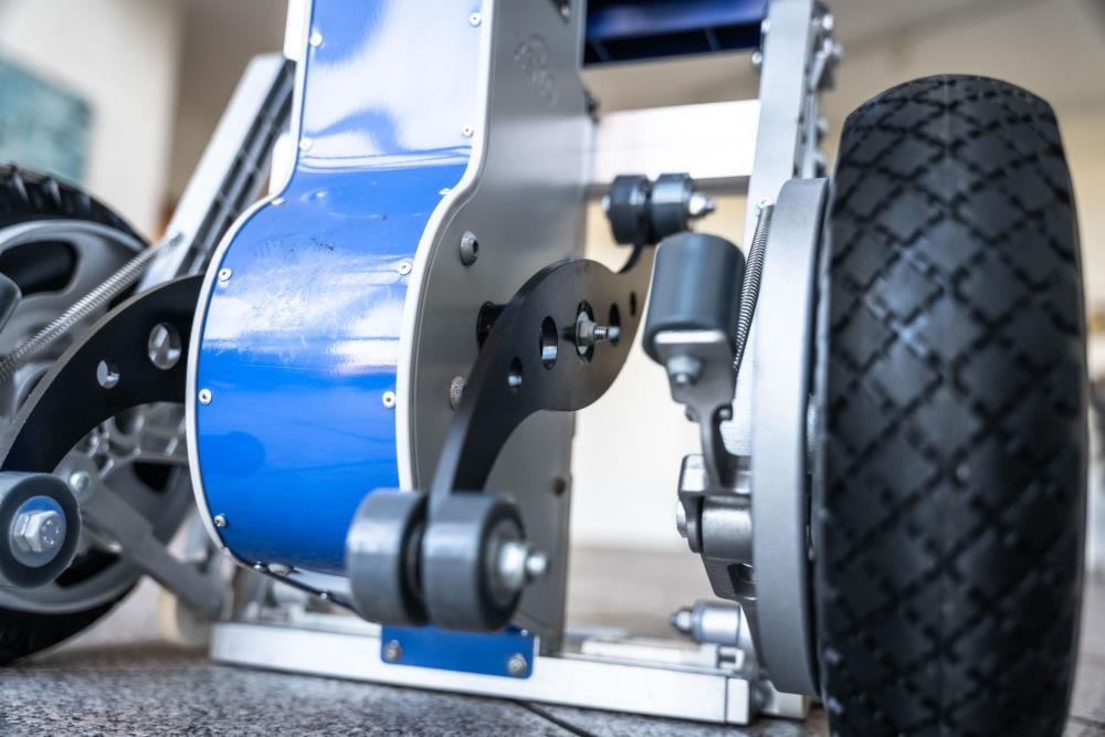 Nutzen Sie den elektrischen Treppensteiger auf ebenem Boden wie einen klassischen Sackkarren. Die Lasten werden wie gewohnt mit der Ladefläche aufgenommen. Transportieren Sie problemlos Lasten bis zu 170 kg zur ersten Stufe oder zum Podest, das überwunden werden soll. Vor Ort aktivieren Sie das automatische System und wählen die Steiggeschwindigkeit. Neigen Sie die Last in Richtung der Stufen, um die Gewichtsverlagerung während des Transports optimal zu steuern. Der Ein-/Ausschalter des automatischen Treppensteigers befindet sich am Griff. Sobald Sie ihn einschalten, beginnt das System, die Stufen zu erklimmen. Die Steighilfen bewegen sich von Stufe zu Stufe wie ein Flügelrad und bringen den Wagen mit der Last auf die nächste Ebene. Beim Treppenabstieg nutzt der elektrische Treppensteiger eine automatische Bremseinheit. Zwei gespannte Räder befinden sich stets auf Höhe der Transportrollen und signalisieren dem System, dass der Wagen vollständig auf einer Ebene steht. Wird der Wagen weiter zur Kante der Stufe bewegt, senken sich die Räder und signalisieren das Ende der Stufe. Die automatische Bremse greift und verhindert ein weiteres Bewegen des Wagens. Die Steighilfe aktiviert sich und führt den gesamten Wagen kontrolliert auf die nächste Stufe. Mit dieser Technik erkennt der Wagen automatisch das Ende der Treppe und den Beginn der nächsten Ebene.
