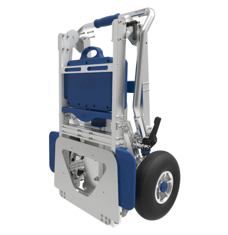 Nutzen Sie den elektrischen Treppensteiger auf ebenem Boden wie einen klassischen Sackkarren. Die Lasten werden wie gewohnt mit der Ladefläche aufgenommen. Transportieren Sie mühelos Lasten bis zu 170 kg zur ersten Stufe oder zum Podest, das überwunden werden soll. Vor Ort aktivieren Sie das automatische System und wählen die Steiggeschwindigkeit. Neigen Sie die Last in Richtung der Stufen, um die Gewichtsverlagerung während des Transports optimal zu steuern. Der Ein-/Ausschalter des automatischen Treppensteigers befindet sich am Griff. Sobald Sie ihn einschalten, beginnt das System, die Stufen zu erklimmen. Die Steighilfen bewegen sich von Stufe zu Stufe wie ein Flügelrad und bringen den Wagen mit der Last auf die nächste Ebene. Beim Treppenabstieg nutzt der elektrische Treppensteiger eine automatische Bremseinheit. Zwei gespannte Räder befinden sich stets auf Höhe der Transportrollen und signalisieren dem System, dass der Wagen vollständig auf einer Ebene steht. Wird der Wagen weiter zur Kante der Stufe bewegt, senken sich die Räder und signalisieren das Ende der Stufe. Die automatische Bremse greift und verhindert ein weiteres Bewegen des Wagens. Die Steighilfe aktiviert sich und führt den gesamten Wagen kontrolliert auf die nächste Stufe. Mit dieser Technik erkennt der Wagen automatisch das Ende der Treppe und den Beginn der nächsten Ebene.