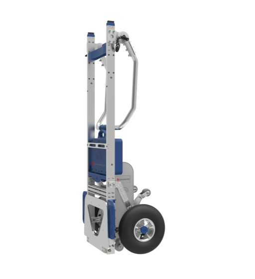 Beim Abstieg nutzt der elektrische Treppensteiger eine automatische Bremseinheit. Zwei gespannte Räder befinden sich stets auf Höhe der Transportrollen und signalisieren dem System, dass sich der gesamte Wagen auf einer Ebene befindet. Wird der Wagen weiter zur Stufenkante bewegt, senken sich die Räder und signalisieren dem System das Ende der Stufe. Die automatische Bremse aktiviert sich und verhindert ein weiteres Abrutschen. Die Steighilfe wird dann aktiviert und bewegt den gesamten Wagen kontrolliert auf die nächste Stufe. So erkennt der Wagen automatisch das Ende der Treppe und den Beginn der nächsten Ebene.