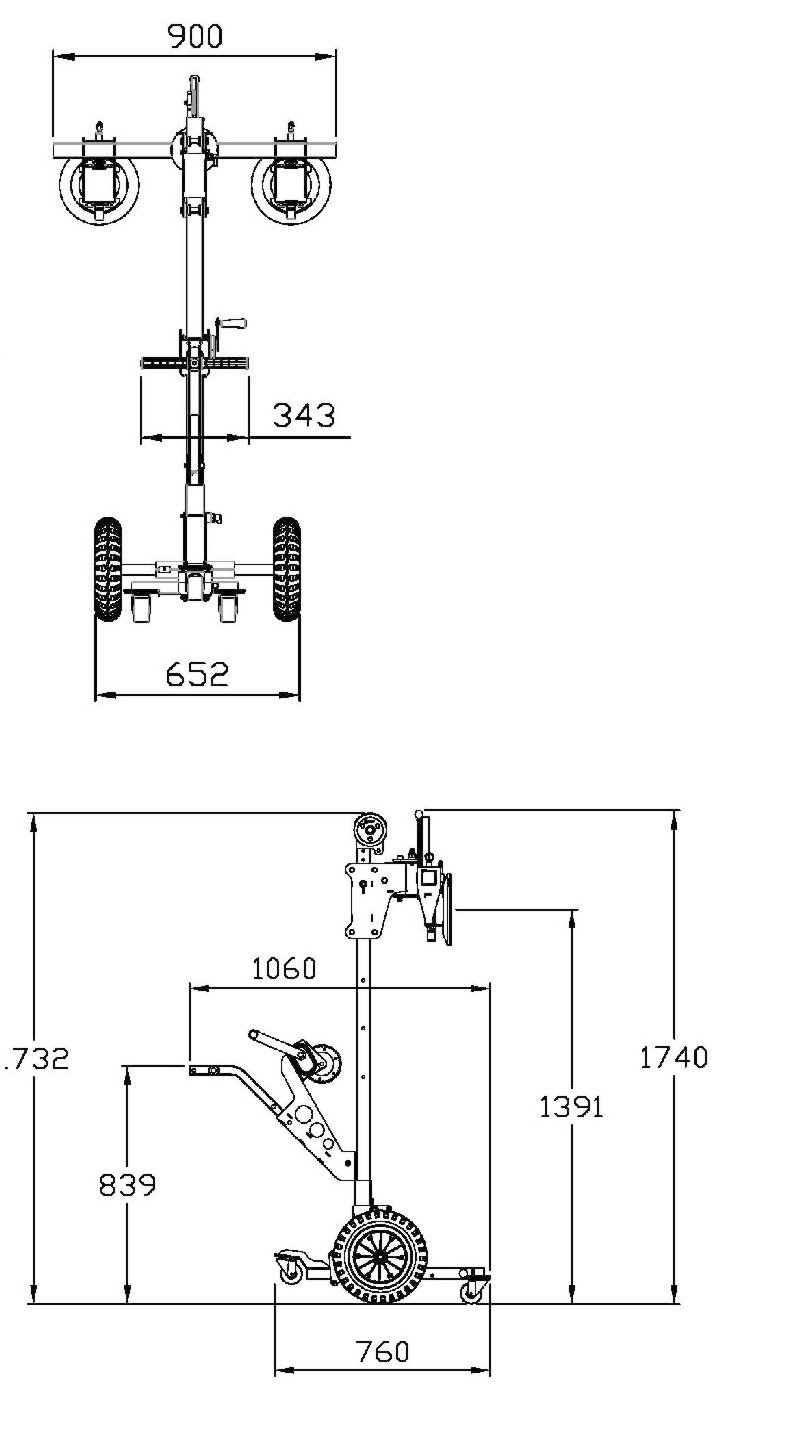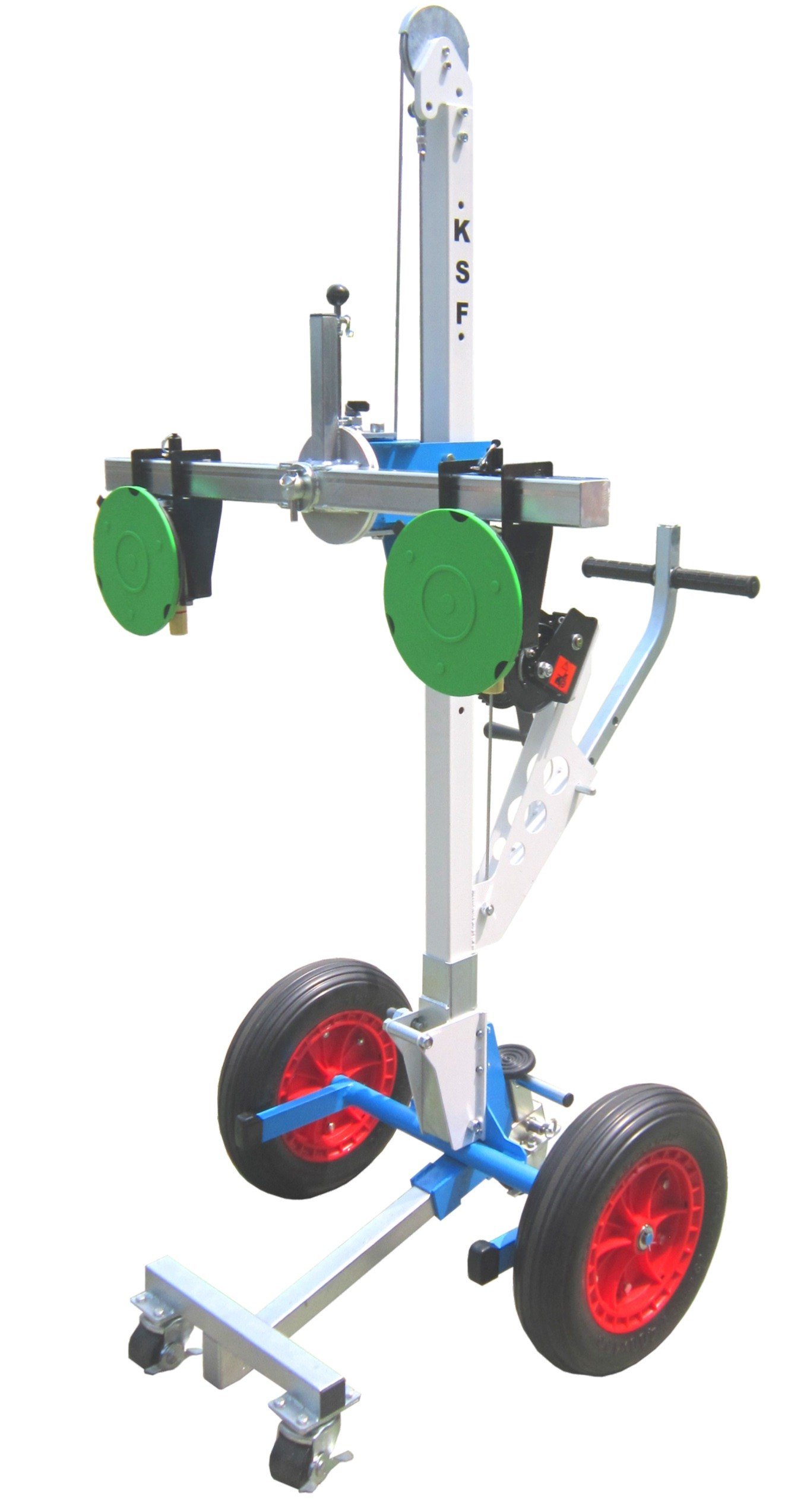 Der Glastransporter SGT2 ist ein ergänzendes Hilfsmittel zum Be- und Entladen sowie Transport von Glasplatten. Mit dem Glasplattenheber SGT2 können Glasplatten bis zu 120 kg sicher aufgenommen und bewegt werden. Die drehbare Saugnapfhalterung ermöglicht eine 360°-Drehung der Glasscheiben bis zu 280 cm. Außerdem lässt sich das Mastgestell um 90° schwenken. Dies bedeutet, dass die Scheiben auch längs transportiert werden können. So passt der SGT2 mit einer Glasplatte durch schmale Türen von 80 cm. Das Mastgestell des Glasplattenhebers SGT2 kann um 15° nach vorne geneigt werden. Diese Funktion erleichtert das Anheben der Glasplatten aus einem Liefergestell. Nutzen Sie das Gerät zum Transport von Glas an unterschiedlichen Einsatzorten – ob Werkstatt, Produktion, Fertigung oder Montage beim Kunden. Mit seinen 16″ pannensicheren Rädern ist das Gerät auch für schwierige Baustellenbedingungen bestens ausgestattet.