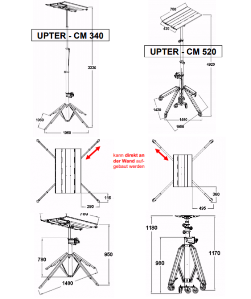 Das Gerät ist auch als CM340 mit 130 kg Tragfähigkeit und maximaler Hubhöhe 3300 mm verfügbar.