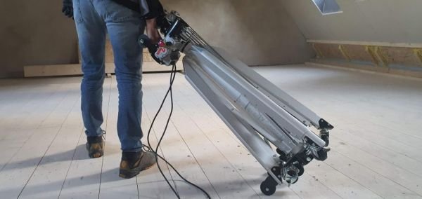 Das Gerät lässt sich in wenigen Minuten von einer Person ohne spezielles Werkzeug aufstellen und bedienen. Mit den kompakten Maßen von 380 x 380 mm und einem Eigengewicht von nur 38 kg ist der Aufzug einfach zu lagern und zu transportieren.