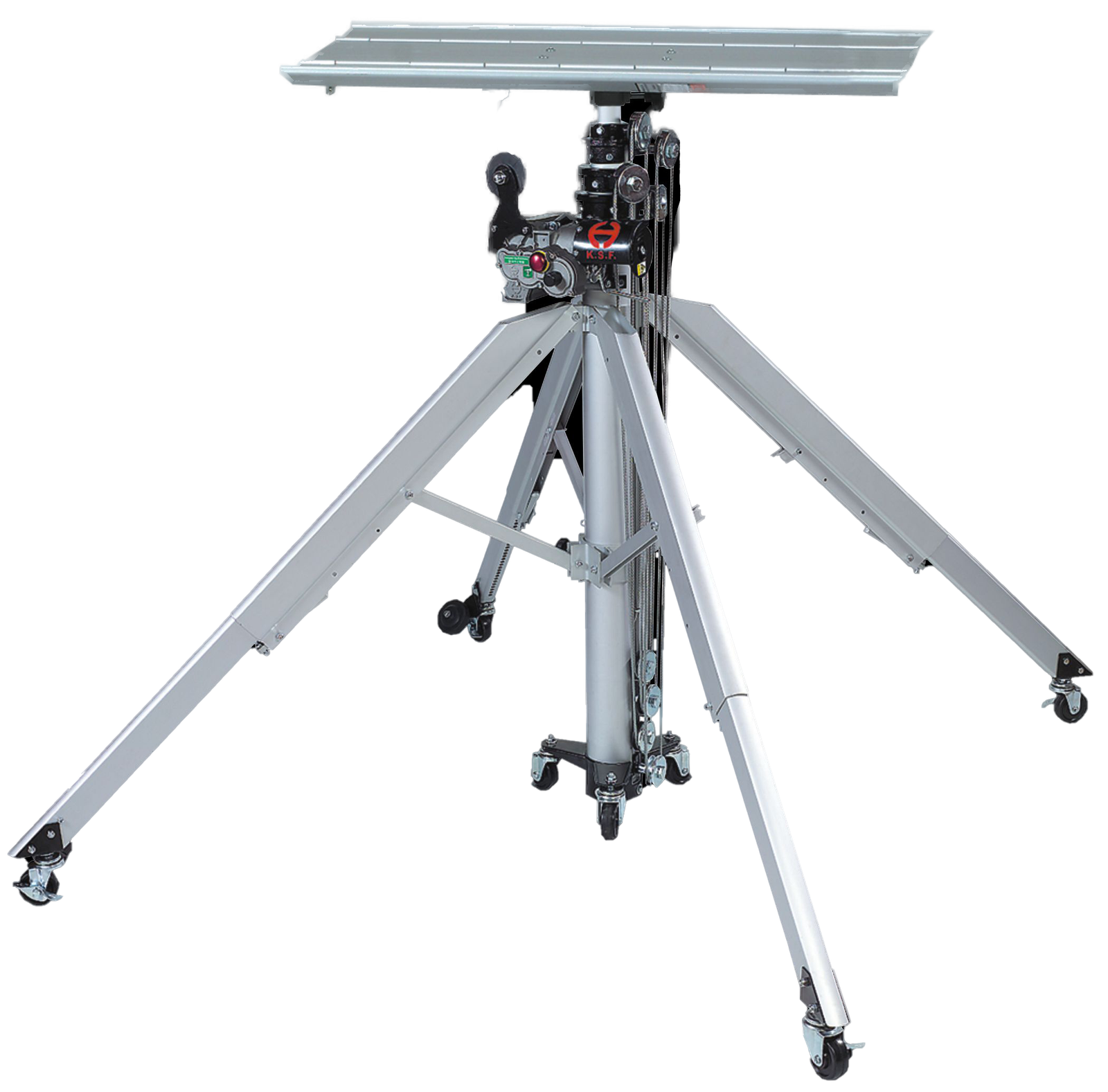 Dank kompakter Bauweise kann der teleskopische Aluminiumaufzug direkt an der Wand positioniert werden. Vier individuell einstellbare Dreifußfüße ermöglichen auch den Einsatz auf Treppen oder unebenen Böden. Für den Transport vom Fahrzeug zum Einsatzort ist der CM520 bereits ab Werk mit Rollen ausgestattet. Der Aufzug ist ideal für sicheres Arbeiten, wenn sperrige oder schwere Gegenstände auf Messen oder Baustellen in die Höhe gebracht werden müssen.