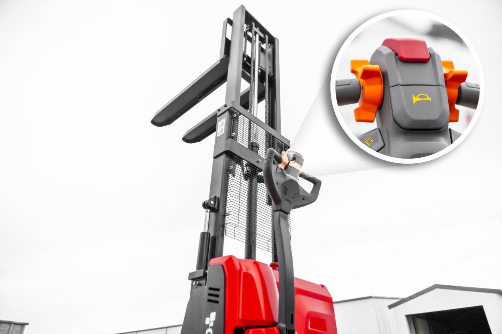 Die anfängliche Hubfunktion erlaubt das gleichzeitige Bewegen von zwei Paletten mit einem Gesamtgewicht von bis zu 1200 kg. Die Bedienung erfolgt intuitiv über den Steuergriff.