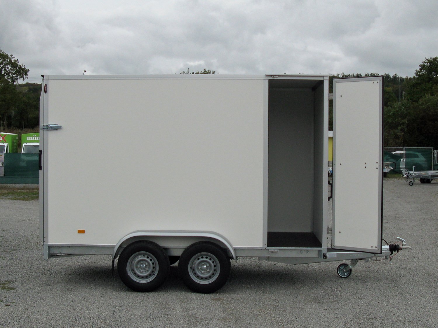 Der Hapert Sapphire L-2 – 2700 ist ein robuster Tieflader-Kofferanhänger, ausgestattet mit einer rutschhemmenden Auffahrklappe mit Gasdruckfedern und einer Seitentüre vorne rechts für einfachen Zugang.