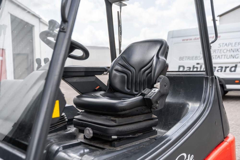 Zum Schutz des Fahrers vor herabfallenden Lasten ist das Linde Load Assist-System installiert. Wenn die Last beim Heben zu stark nach vorne kippt, greift das Assistenzsystem ein und regelt die Vorwärtsbewegung sowie die Hubgeschwindigkeit abhängig von der Hubhöhe. Dadurch wird ein Umkippen des Gabelstaplers verhindert.