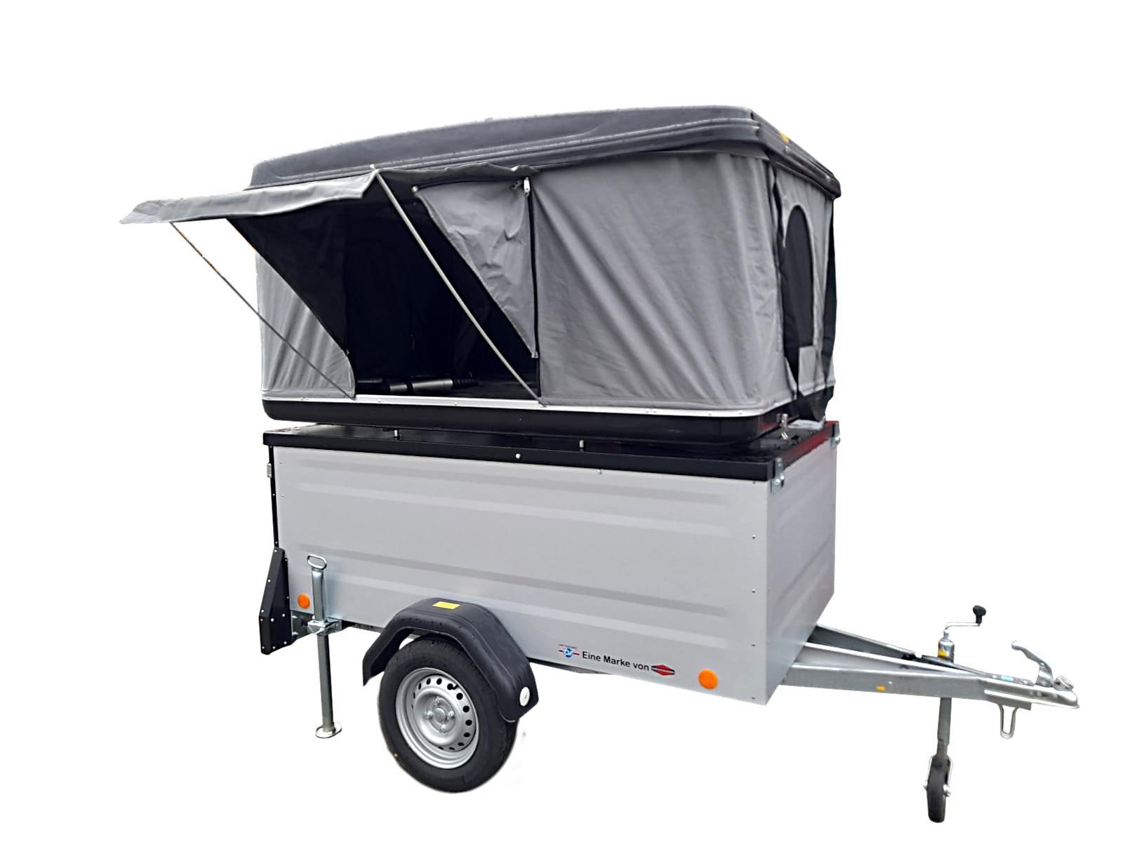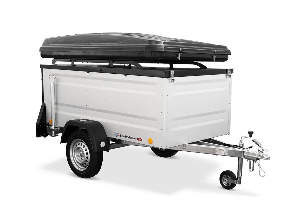 In dem einachsigen gebremsten Kofferanhänger mit nach oben aufstell- und abschließbarem spritzwassergeschütztem Deckel mit Reling können Sie Ihr komplettes Camping-Equipment sicher verstauen. Der Deckel hat eine verstärkte Dachreling und stärkere Stoßdämpfer – damit wird die Traglast des Deckels auf 250 kg erhöht.