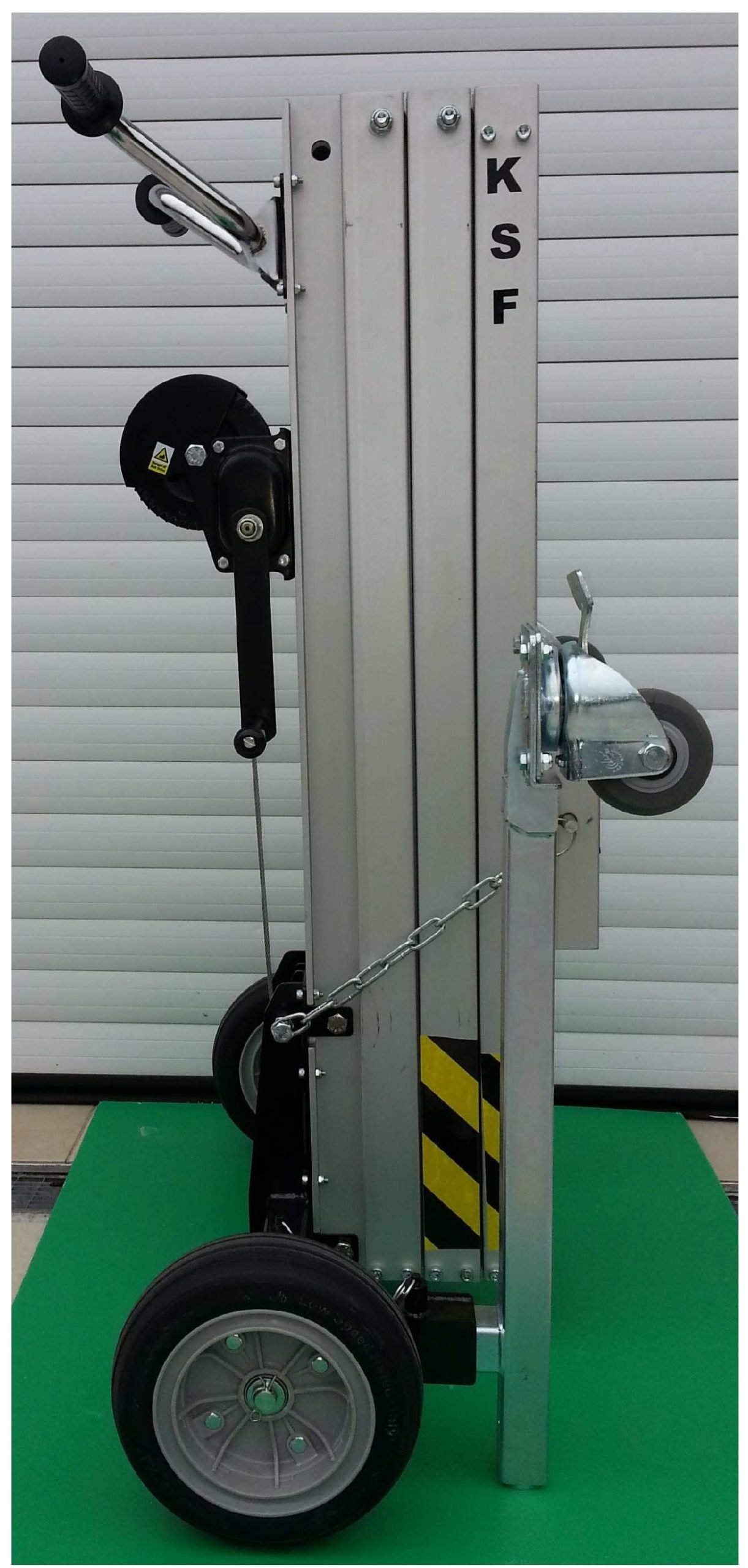 Der manuelle Montageaufzug ist mit einem teleskopischen Aluminiummast ausgestattet. Die Hubfunktion wird über eine Kurbel-Windenbedienung gesteuert, sodass das Gerät jederzeit einsatzbereit ist, auch ohne Netzanschluss. Die Lastarme sind mit Rollen und Bremse versehen. Die großen Hinterräder mit einem Durchmesser von 250 mm sorgen für einen leichten Transport zur Einsatzstelle und hervorragende Manövrierfähigkeit. Die Stabilisatoren sind individuell einstellbar und eignen sich auch für größere Unebenheiten.