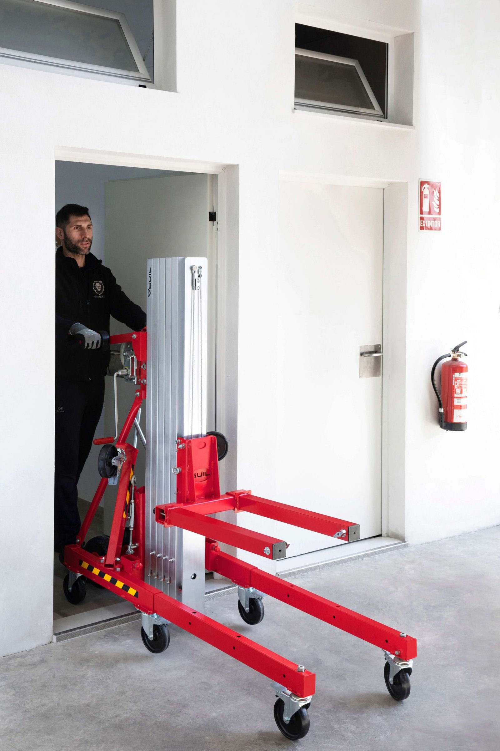 Das Gerät ist serienmäßig mit abnehmbaren, verstellbaren oder umkehrbaren Lastgabeln ausgestattet. Zehn Schwerlastrollen erleichtern die vertikalen und horizontalen Manöver sowie den Transport des Aufzugs. Darüber hinaus ist jedes Gerät mit zwei klappbaren Stützfüßen (Stabilisatoren) mit Rollen ausgestattet, die als seitliche Stabilisatoren dienen. Dies ermöglicht eine präzisere vertikale/seitliche Einstellung, um die vollständige Stabilität des Aufzugs zu gewährleisten. Für schnelles, sicheres und müheloses Heben ist das Gerät mit einer selbstbremsenden Winde ausgestattet, die die Last auf der gewünschten Höhe hält, sobald der Griff losgelassen wird. Die Kurbel kann zum leichteren Transport des Aufzugs abgenommen werden. Die Basis des Geräts kann in zwei Breitenpositionen eingestellt werden, um eine größere Stabilität des Aufzugs zu gewährleisten oder Arbeiten in engen Räumen zu ermöglichen.