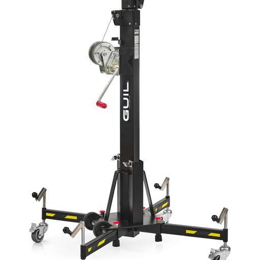 Der Aufzug kann sowohl innen als auch außen verwendet werden und eignet sich für industrielle, gewerbliche oder private Anwendungen. Das Gerät besteht aus vier teleskopischen Stahlsektionen mit schwarzer Epoxylackierung und speziellen Kratzschutzeigenschaften. Diese Eigenschaft, kombiniert mit Edelstahlkomponenten, macht den Aufzug für den Außeneinsatz geeignet und garantiert maximale Korrosionsbeständigkeit. Für ein schnelles, sicheres und müheloses Heben ist der Aufzug mit einer manuellen Winde mit automatischem Bremssystem ausgestattet, die die Last auf der gewünschten Höhe hält, sobald der Griff losgelassen wird. Das Untergestell ist kompakt, sodass der Aufzug durch jede Standardtür manövriert werden kann. Für eine einfache Handhabung ist das Gestell mit zwei robusten Rollen ausgestattet. Jeder Aufzug kann von einer Person installiert und bedient werden, was Zeit spart und die Produktivität erhöht.