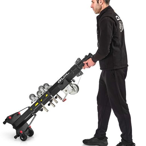 Die Füße des Aufzugs sind klappbar und mit Nivellierstützen ausgestattet, sodass eine konstante Höhe eingestellt werden kann. Eine integrierte Wasserwaage erleichtert die schnelle vertikale Ausrichtung. Zusätzlich sind Rollen integriert, um den Transport zu erleichtern.