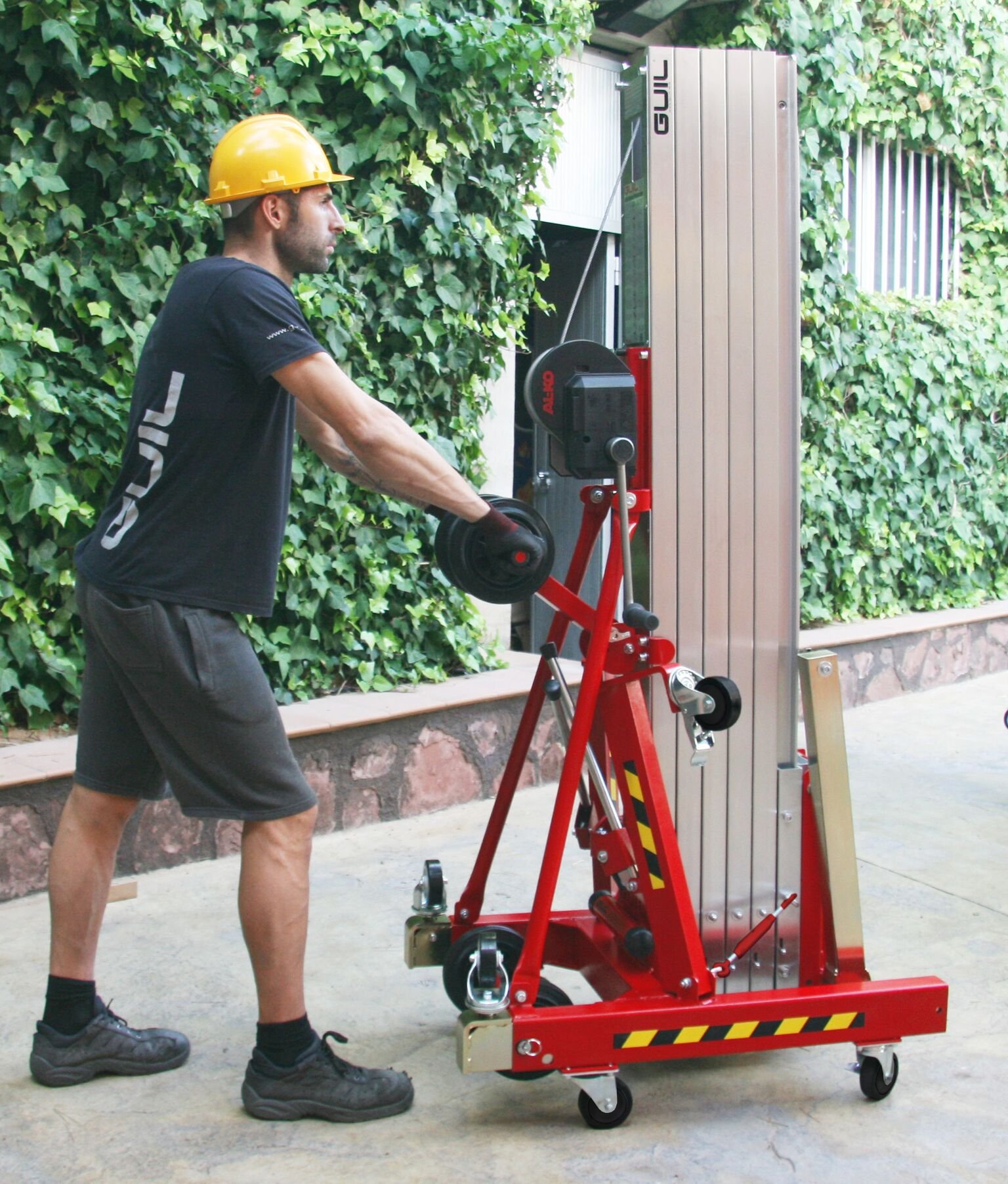 Das Gerät ist standardmäßig mit abnehmbaren, verstellbaren oder umkehrbaren Lastgabeln ausgestattet. Zehn Schwerlasträder erleichtern vertikale und horizontale Bewegungen sowie den Transport des Aufzugs. Darüber hinaus ist jedes Gerät mit zwei klappbaren Stützbeinen mit Rädern ausgestattet, die als seitliche Stabilisatoren dienen. Dies ermöglicht eine präzisere vertikale/laterale Einstellung, um eine vollständige Stabilität des Aufzugs zu gewährleisten. Für ein schnelles, sicheres und müheloses Heben ist das Gerät mit einer automatischen Bremswinde ausgestattet, die die Last in der gewünschten Höhe hält, sobald der Griff losgelassen wird. Die Kurbel kann zur Erleichterung des Transports entfernt werden. Die Basis des Geräts kann in zwei Breitenpositionen eingestellt werden, um eine größere Stabilität des Aufzugs zu gewährleisten oder Arbeiten in engen Räumen zu ermöglichen, wo der Platz begrenzt ist.