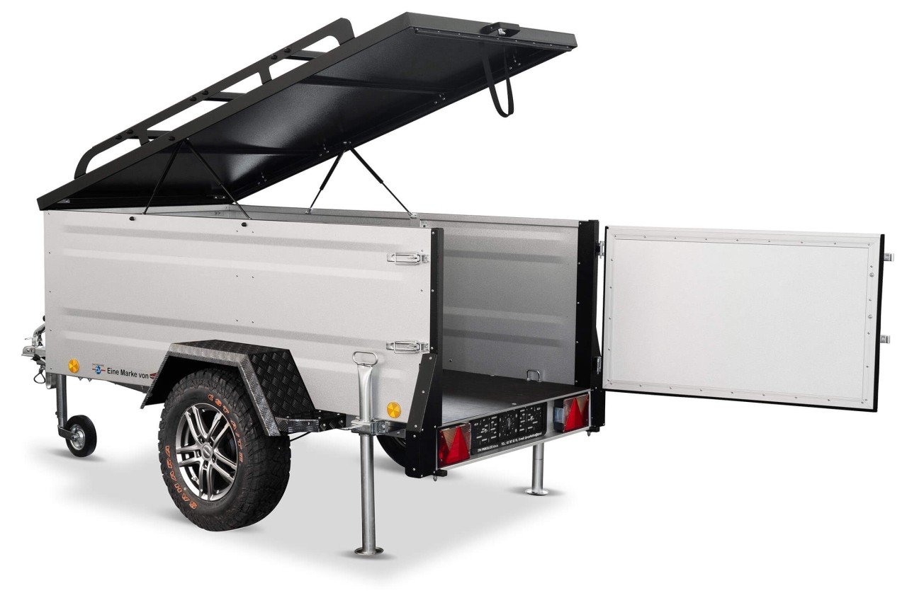 Dank der Aluminium-Zinkbeschichtung eignet sich der Anhänger hervorragend für den Geländeeinsatz. Die grobstollige Offroadbereifung sorgt für mehr Bodenfreiheit, während die verstärkten Kotflügel begehbar sind. Die 1,5 mm starken Seitenwände aus Alu-Zink-beschichtetem Stahlblech gewährleisten eine hohe Stabilität. Optional ist der Anhänger gegen Aufpreis auch in schwarz pulverbeschichtet erhältlich.