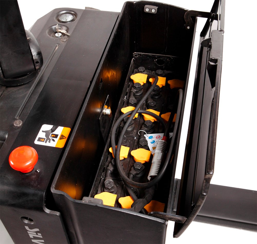 Der Elektro-Hubwagen wird von einer 210-Ah-Batterie betrieben und kann somit den ganzen Arbeitstag über eingesetzt werden. Der elektrische Antrieb des Gehstaplers erleichtert Ihre tägliche Arbeit und fördert ein ergonomisches Arbeiten für Ihre Mitarbeiter. Der Hubwagen ist mit einer regenerativen elektromagnetischen Bremse ausgestattet, die gute Leistung bietet und den Verschleiß reduziert. Dank der integrierten Notbremse können Unfälle im Unternehmen durch schnelle Reaktionszeiten vermieden werden. Das Gerät ist sehr kompakt, sodass Griffe und Fahrstand einklappbar sind. Die Bedienelemente sind für einfache Handhabung und ergonomisches Arbeiten ausgelegt.