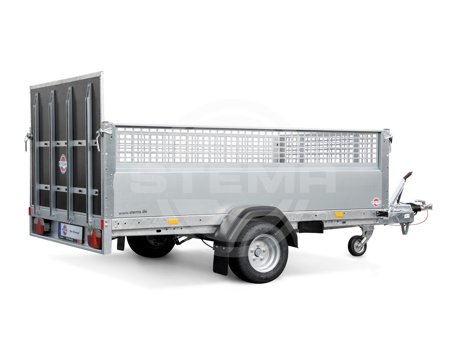 Dieser Anhänger ist mit einer halboffenen Gitterbeplankung (660 mm hoch) sowie einer Rückwand (700 mm) ausgestattet, die zusätzliche Stabilität und Schutz bieten. Die Sicherung der Kippbrücke am Fahrgestell erfolgt durch einen Spannverschluss.