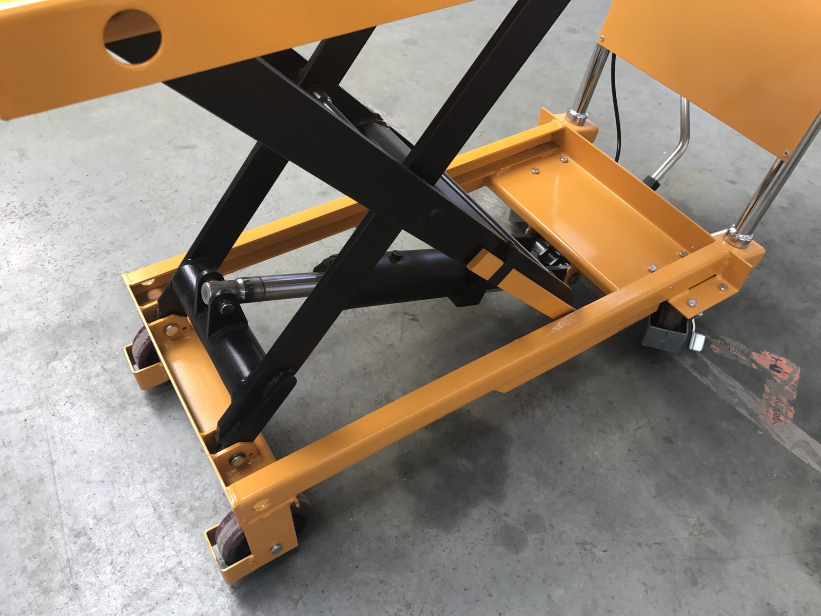Hub über Pedal, kontinuierliches Absenken über Handhebel am Griff, alternativ auch mit Tragfähigkeiten von 150, 500 und 1000 kg erhältlich.