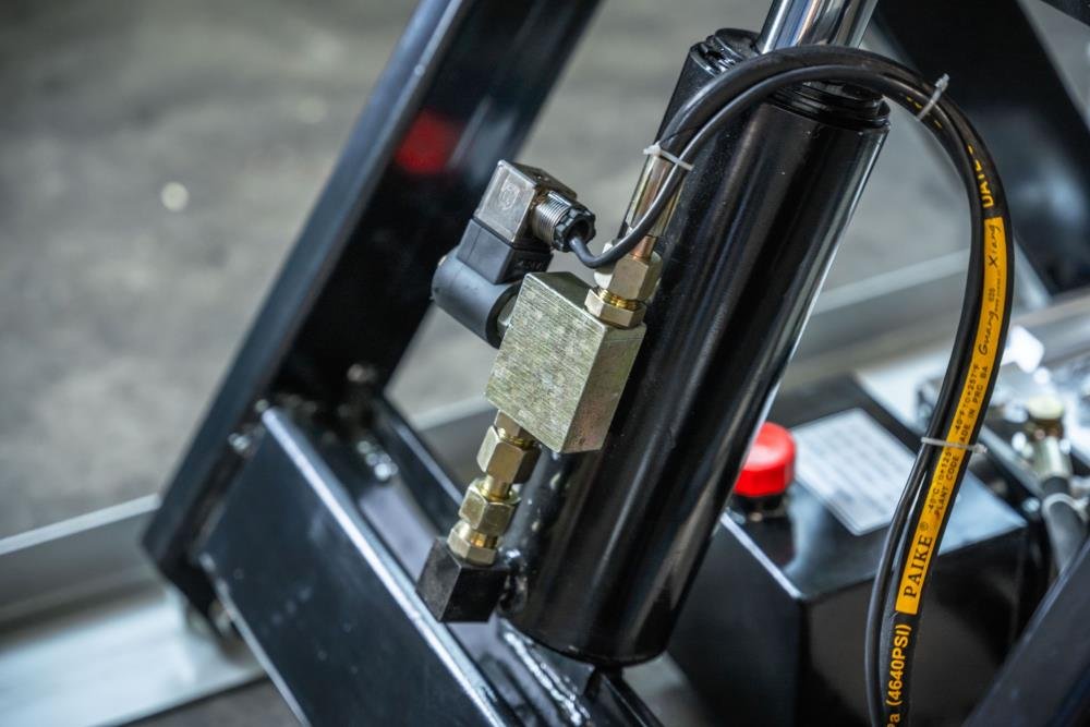 Der Hubtisch wird über ein Drehstromkabel (380 V/16 Ah) mit Starkstrom versorgt. Die Absenkgeschwindigkeit der Plattform kann über ein Absenkventil reguliert werden.