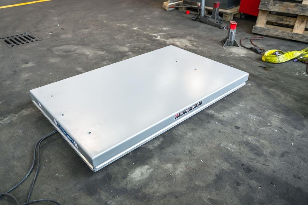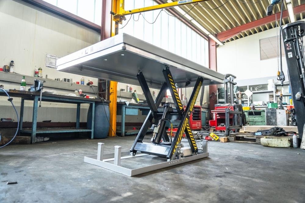 Zur Erhöhung der Lebensdauer des elektrohydraulischen Arbeitstisches wurden robuste Stahlprofile und wartungsfreie Scharnierstifte verbaut. Ein Hubzylinder mit internem Ablaufsystem verlängert ebenfalls die Lebensdauer des Scherenhubtisches.
