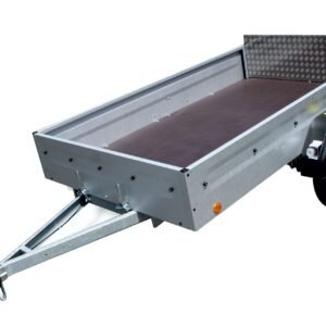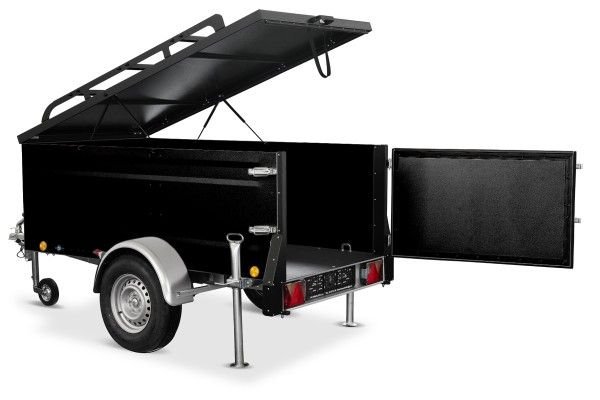 Dank seiner stabilen Konstruktion und der schwarz pulverbeschichteten Oberfläche bietet der Anhänger eine hohe Widerstandsfähigkeit und eine ansprechende Optik. Die verstärkten Kotflügel sind begehbar, und die Aluminium-Zink-beschichteten Seitenwände sorgen für zusätzliche Robustheit.