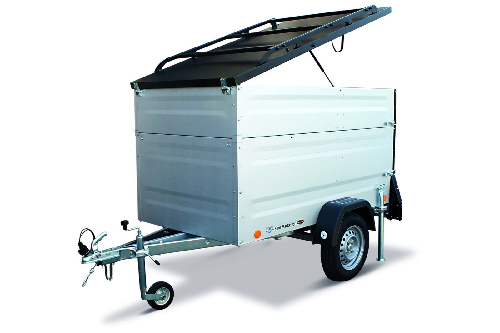Dank der erhöhten Bordwand bietet der Anhänger eine Innenhöhe von über 1 m, sodass auch größere Gegenstände sicher transportiert werden können. Die Aluminium-Zink-beschichteten Stahlblechwände sorgen für Stabilität und Widerstandsfähigkeit. Die schwarz pulverbeschichtete Oberfläche verleiht dem Anhänger ein modernes und robustes Erscheinungsbild.