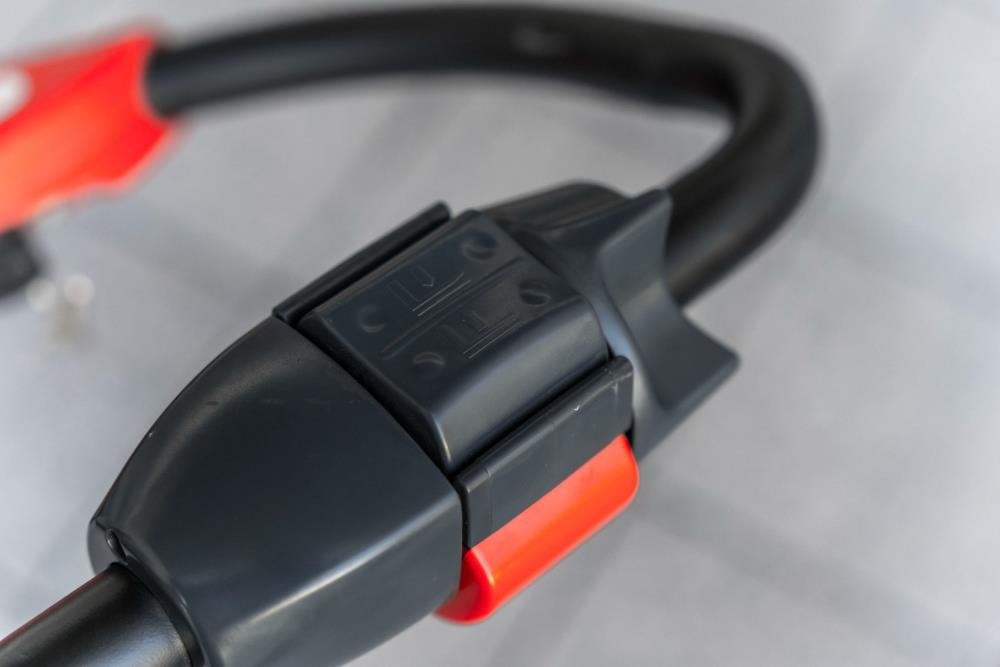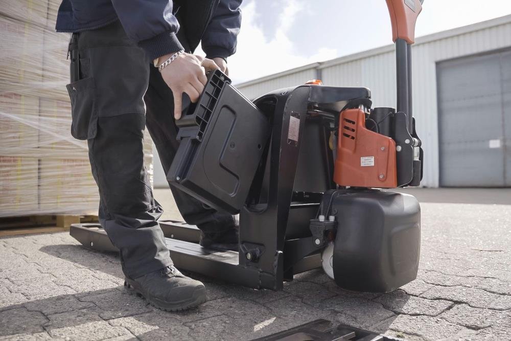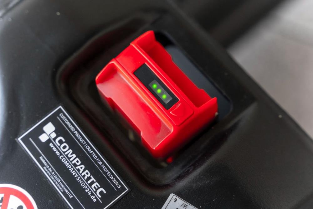 Bei diesem Gerät können beide Batterien von rechts oder links eingesetzt oder entnommen werden. Die Lithium-Ionen-Batterien sind sicher im Halter fixiert, lassen sich jedoch ohne feste Verriegelung entnehmen. Dies kann bei unebenem Boden während Hebe- und Fahrvorgängen zu Klappergeräuschen führen.
