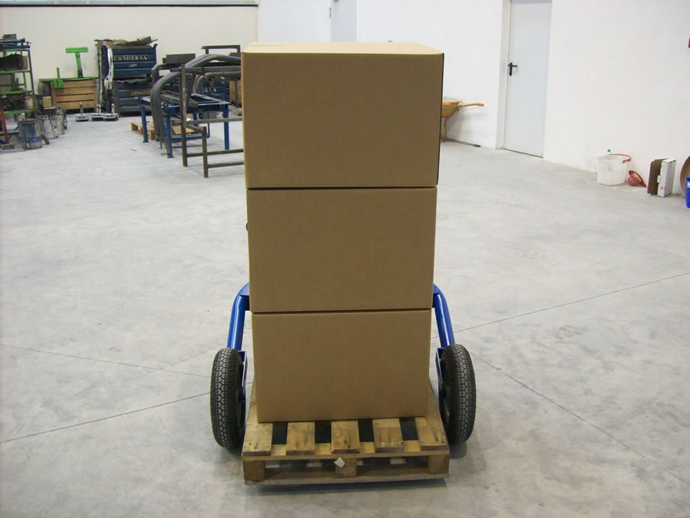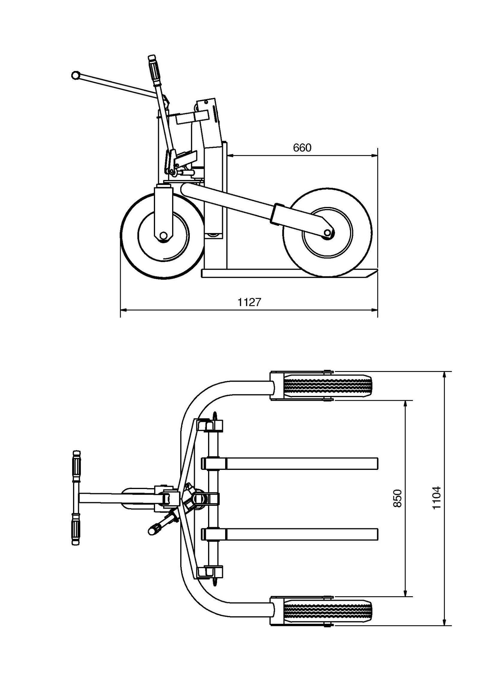 Der Geländestapler ist mit profilierten Reifen ausgestattet, was ihn ideal für Wege aus Schotter oder Kies macht. Der Außenabstand der Gabeln kann dank verstellbarer Gabeln individuell bis zu einer maximalen Palettenbreite von 850 mm gewählt werden. Mit der verkürzten Gabel von 660 mm ist das Gerät auch für Halbpaletten geeignet. Der Geländestapler verfügt über einen verstärkten Hubdeichsel.