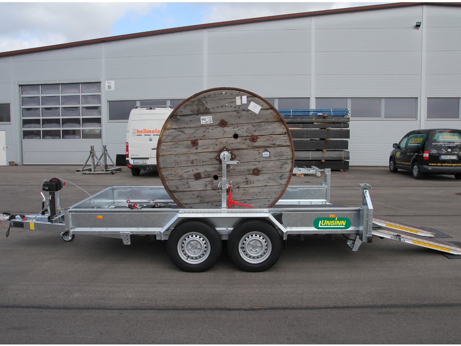 Der Unsinn UB 3618-35-14 KA ist ein leistungsstarker Kabeltrommelanhänger mit einer höhenverstellbaren Halterung für Kabeltrommeln (600-1000 mm), die eine maximale Belastung von 1500 kg ermöglicht. Er verfügt über einen Windenbock mit einer 900 kg Handseilwinde sowie eine schraubbare Bodenverstärkung (Gewicht: 155 kg), die die Nutzlast reduziert. Eine Besonderheit dieses Modells sind die seitlich wegklappbaren Rampen, die eine Staplerbeladung erleichtern.