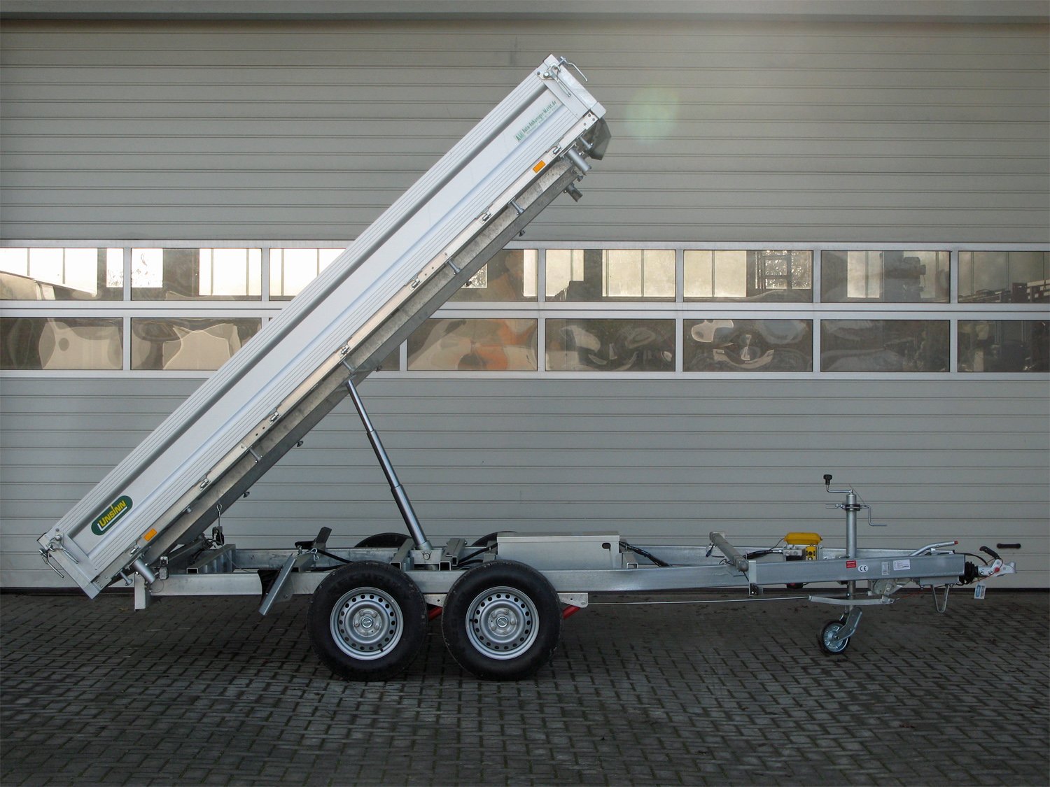 Der Unsinn UDK 3620-35-14 ist ein leistungsstarker 3-Seiten-Kipper mit einer robusten Konstruktion für höchste Stabilität und Fahrsicherheit. Die hydraulische E-Pumpe wird von einer Batterie gespeist und verfügt über ein Ladegerät sowie eine Notpumpe „Pumpless“ für Akkuschrauber. Der klappbare Kennzeichenhalter ermöglicht eine praktische Verstauung der Auffahrschienen unter der Ladefläche. Das verwindungssteife Längsträgerfahrgestell mit Hohlprofilkonstruktion ist komplett verschweißt und im Tauchbad feuerverzinkt. Zudem ist die Halterung für Auffahrschienen bereits vorbereitet. Das verstärkte Automatikstützrad bietet eine Tragkraft von 500 kg, während das Spinlock-Ladungssicherungssystem mit Topfmagnet und 14 versenkten Zurrpins (Zugkraft je 1.500 kg) eine sichere Ladungssicherung gewährleistet. Die Aluminium-Hohlprofil-Bordwände sind eloxiert, vierseitig abklappbar und mit Hakenverschlüssen ausgestattet. Die Heckbordwand ist abklappbar und mit einer Stahlbeplankung versehen. Vier steckbare Stahleckrungen sorgen für zusätzliche Belastbarkeit, und der Stahlboden ist aus einem Stück gekantet für maximale Stabilität.