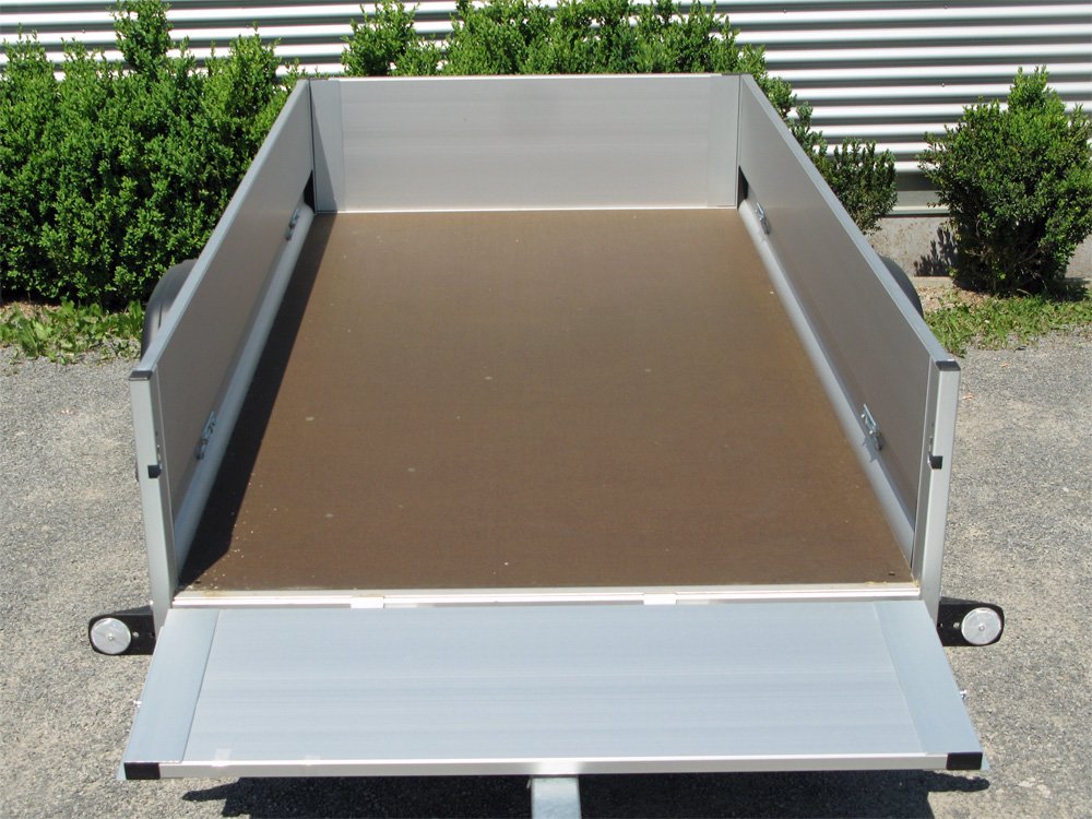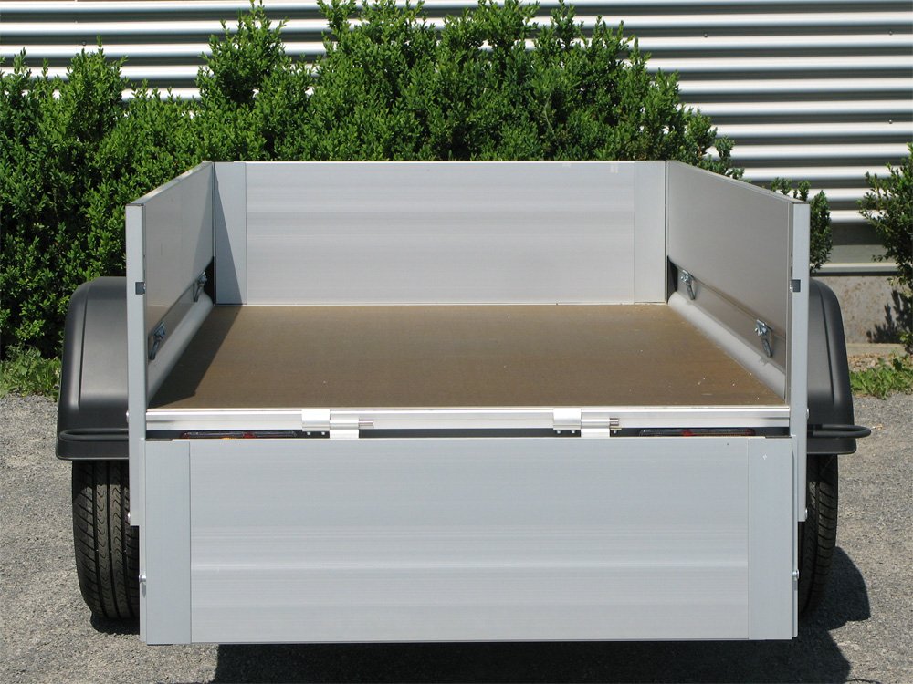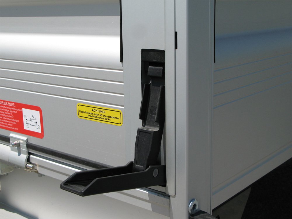- Aluminium-Hohlprofil-Bordwände, eloxiert, hinten abklappbar mit versenkten Verschlüssen